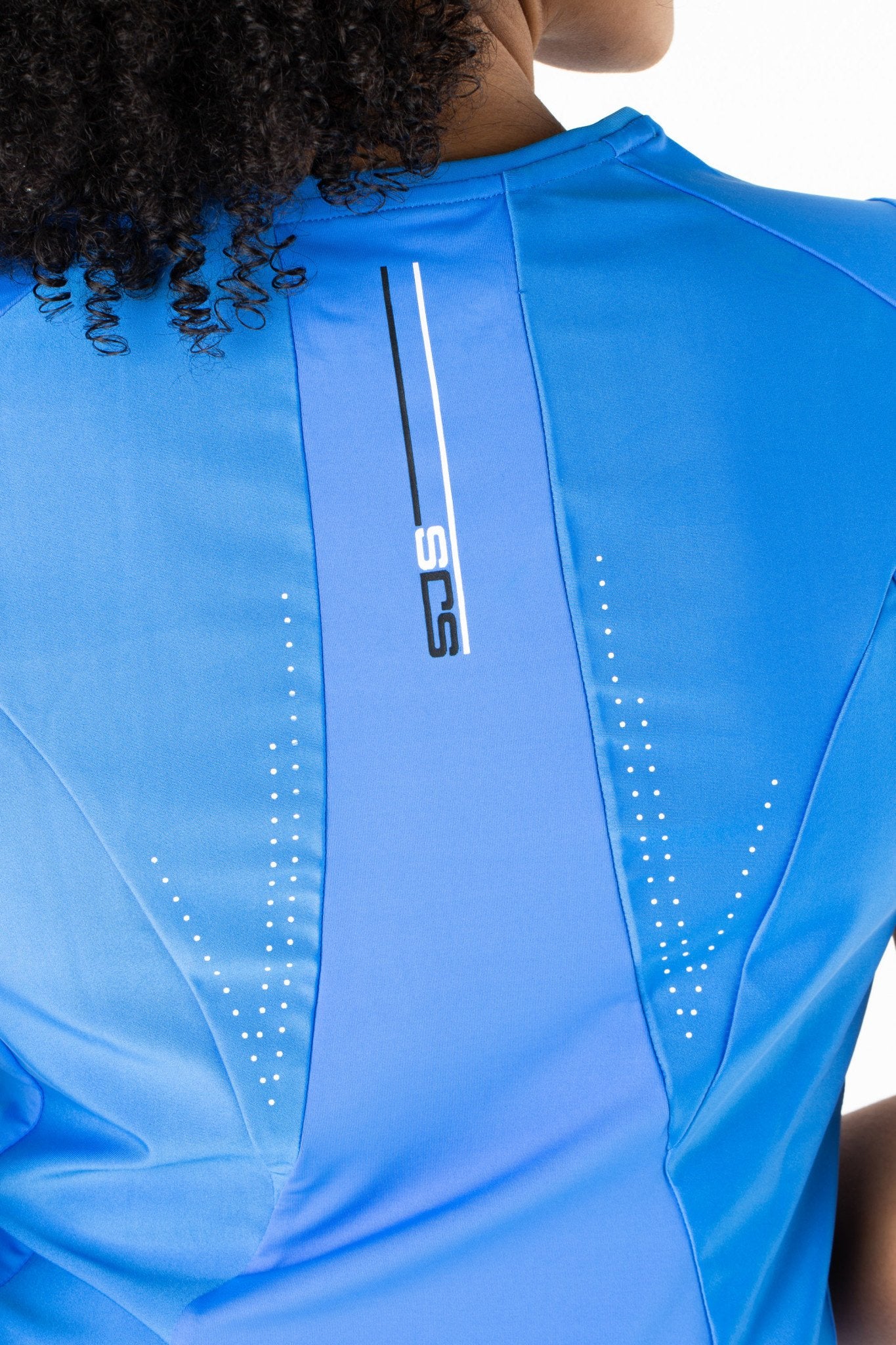 Het sportieve shirt heeft een schitterende kleur blauw, hoge ronde hals met mooie details en een mooie aansluitende pasvorm. Het lichtgewicht materiaal biedt veel ventilatie en zorgt voor optimale zweetafvoering.