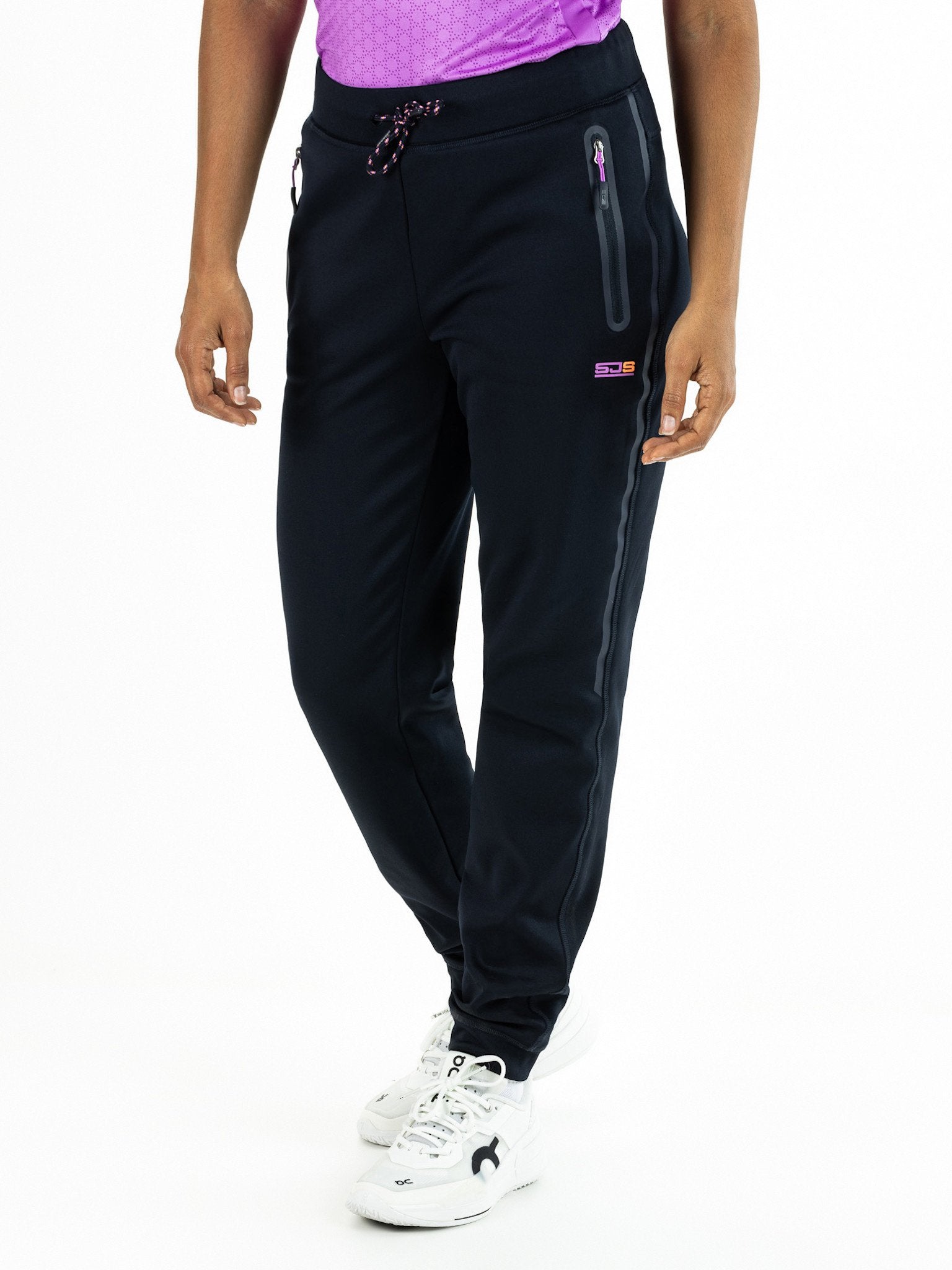 Comfortabele dames multisportbroek gemaakt van donkerblauwe powerstretch met een geborstelde binnenkant. Deze broek heeft zakken met ritssluitingen en boorden bij de enkels. Langs de zijkanten en ritssluitingen loopt seal-on tape en de broek heeft gekleurde details zoals een trekkoord in de taille en een print met het logo van Sjeng Sports.