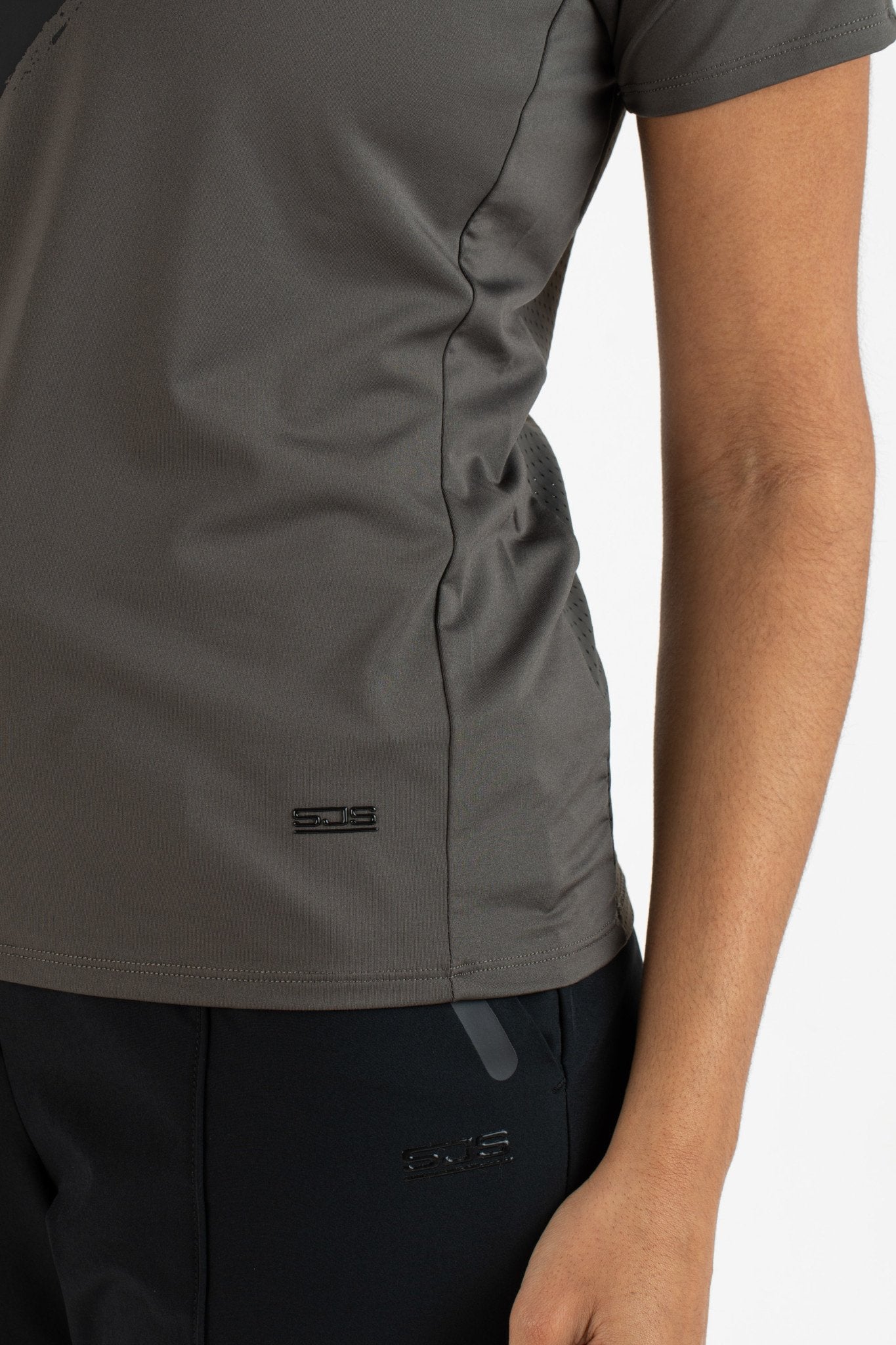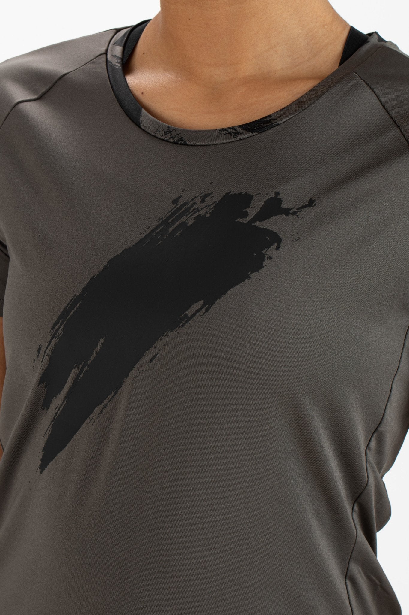 Trendy dames t-shirt van single jersey in de kleur moonstone grijs, met een rugzijde van zeer rekbare rib jersey. Dit t-shirt heeft een opvallende print aan de voorzijde en aan de achterkant een siliconen print. Met de legging Suki uit de Sjengs Sports collectie kun je dit shirt goed combineren tot een geheel.
