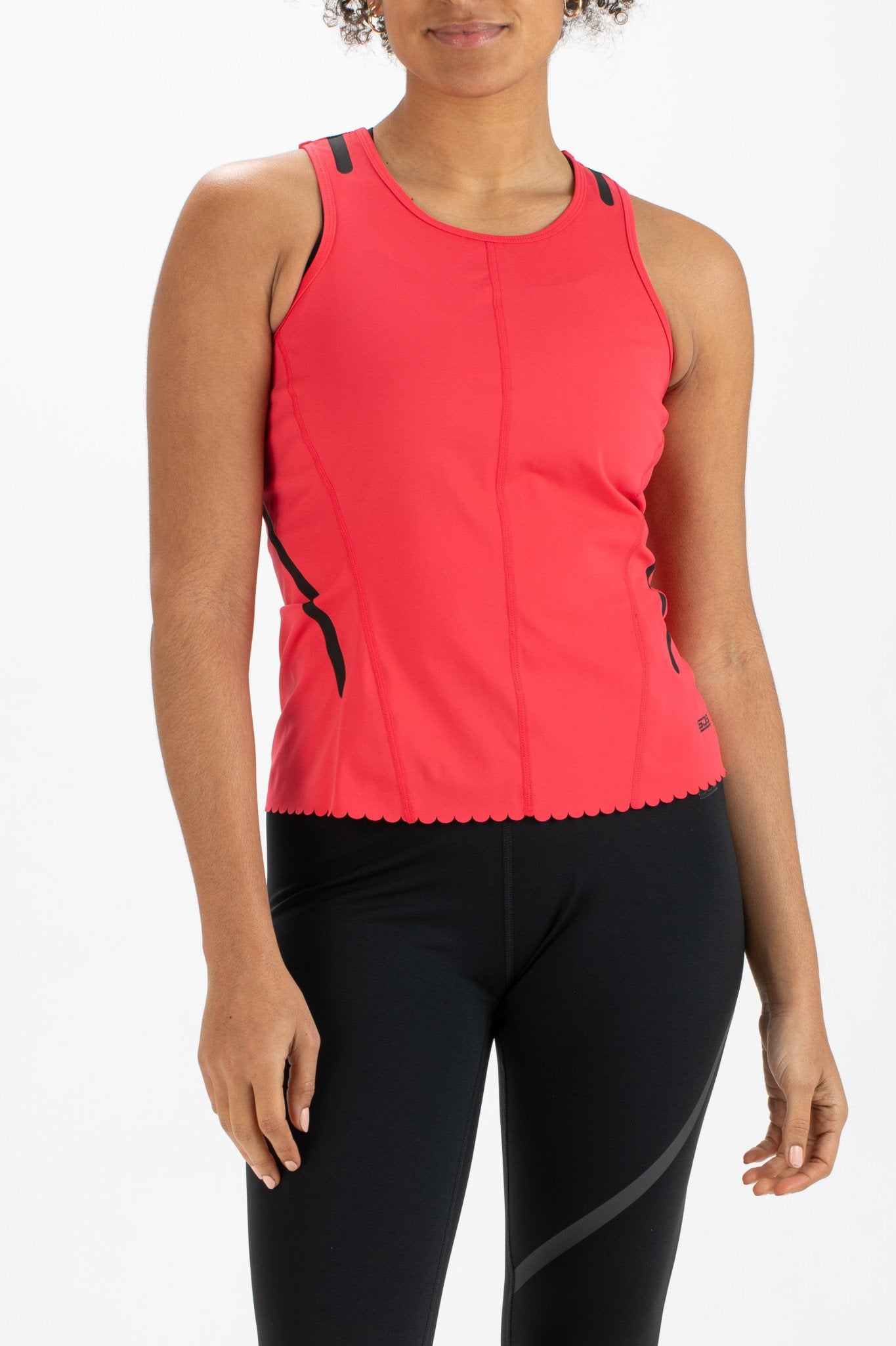Trendy dames singlet met een mooie, vrouwelijke belijning en als opvallend detail opgedrukte siliconen strepen. Deze singlet is gemaakt van multistretch in de zomerse kleur watermelon rood. Onderaan bij de zoom zit een schulprand.