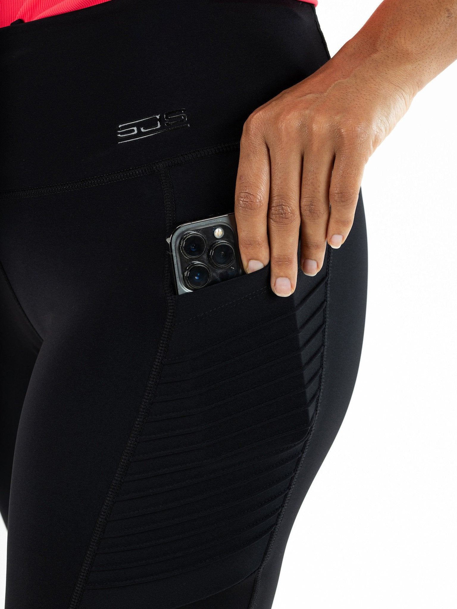 Zwarte dames legging met diagonale pintucks aan de zijkanten. Deze soepele legging van 4-way multistretch heeft een zakje voor je sleutels in de tailleband. De legging is heerlijk om in te sporten maar misstaat ook zeker niet als je hem gewoon in je vrije tijd draagt.