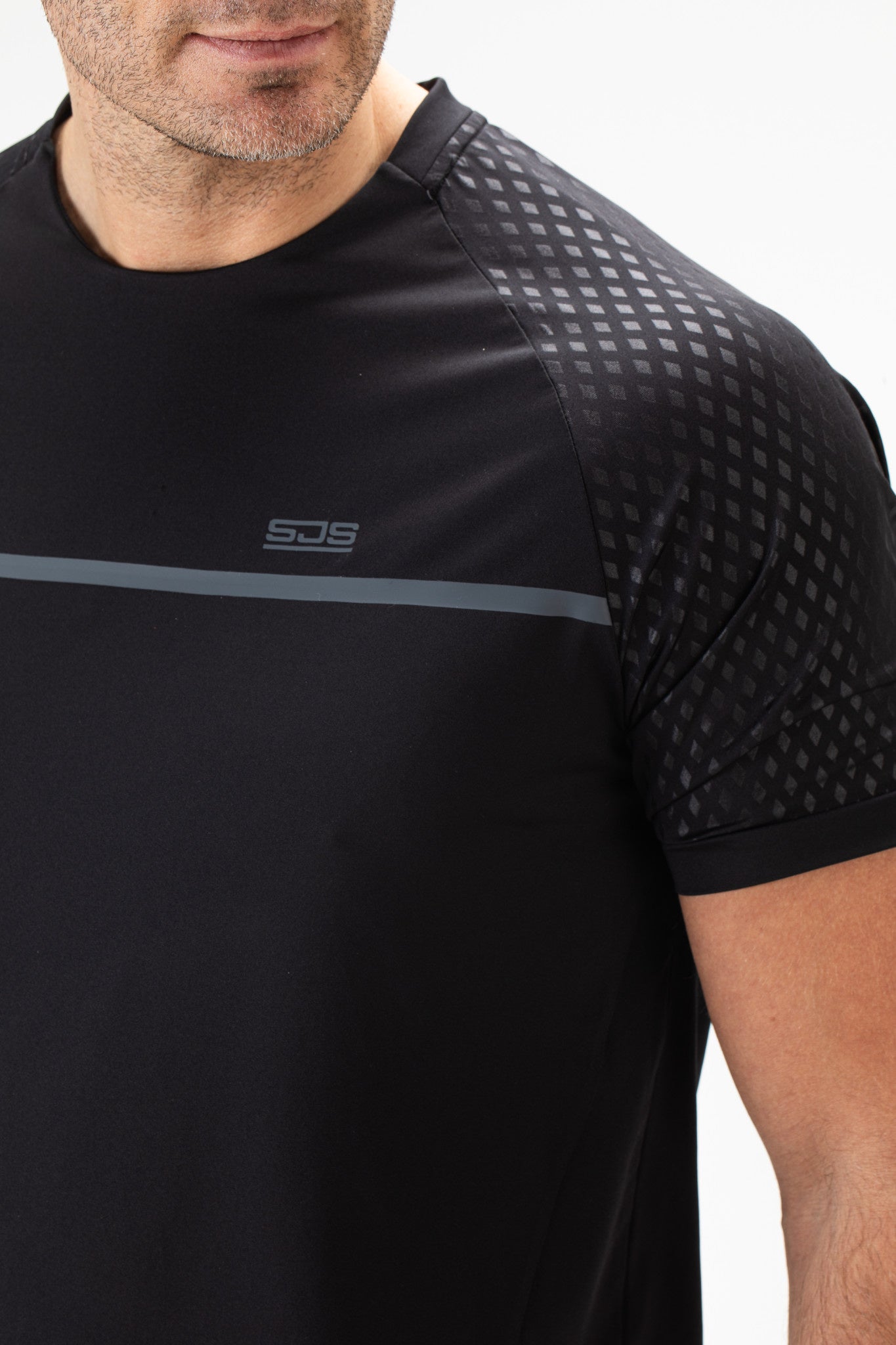 Modieus heren t-shirt met een body van zwarte single jersey en mouwen met een 3D geprint ruitjespatroon. Over de borst loopt een horizontale streep met daarboven het Sjeng Sports logo en midden op de rug is het Sjeng Sports logo met stippen geprint.