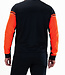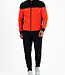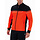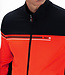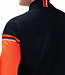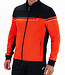 Sportief heren trainingsjack, gemaakt van powerstretch materiaal in de kleur bright tangerine gecombineerd met een in reliëf gebreide donkerblauwe bovenkant. Over de body en mouwen lopen horizontale strepen met siliconen print en dit jack heeft verborgen zakken met ritsen.