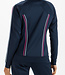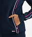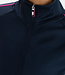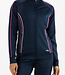 Comfortabel, loose fit trainingsjack voor dames. Dit trainingsvest is gemaakt van stevige, dubbelgebreide, donkerblauwe tricot. Het heeft als opvallende details biezen in contrasterende kleuren en het is voorzien van twee steekzakken met ritsen.