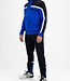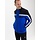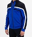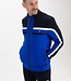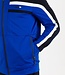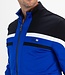 Heren trainingsjack gemaakt van powerstretch in de kleur blue neon. Dit track jacket heeft donkerblauwe inzetten met reliëf strepen bij de schouders en langs de bovenkant van de mouwen. Daarlangs lopen contrasterende strepen.