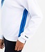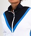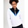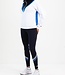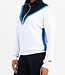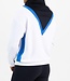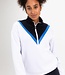 Witte half zip sweater voor dames. Deze fijne, comfortabele sweater heeft een loose fit en de mouwen zijn laag ingezet. De wijde donkerblauwe kraag kun je omvouwen en vastzetten met drukknoopjes. Langs de zijkanten en de v-vormige inzet op de voorkant lopen contrasterende strepen en de sweater heeft handzakken met verborgen ritsen.
