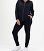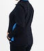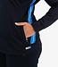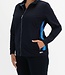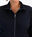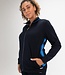 Donkerblauw dames trainingsjack met een mooie, afkledende belijning dankzij de naden en de contrasterende strepen langs de taille. Ook langs de kraag van dit plus size, powerstretch track jacket loopt een contrasterende streep en langs de ritssluiting loopt contrasterend stiksel.