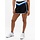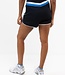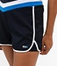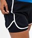 Dames short van donkerblauwe, geweven horizontale stretch met een stevige stretch tailleband van jersey. De short heeft ingezette, contrasterende strepen en een contrasterende zoom die ook langs de zijkanten van de benen loopt. Het binnenbroekje is gemaakt van stretch jersey.