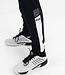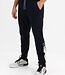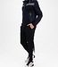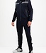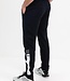 Sportieve heren trainingsbroek van donkerblauwe powerstretch. Deze fijne, soepele broek heeft bij de kuiten een opvallende siliconen print. Onderaan de pijpen zitten ritssluitingen en de broek heeft ook een achterzak met ritssluiting.
