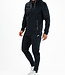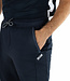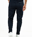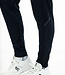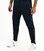 Sportieve donkerblauwe heren broek van dubbelgebreide tricot met ritssluitingen onderaan bij de enkels. Langs de zakken en over de kuiten van deze comfortabele multisportbroek lopen smalle diagonale biezen. Een heerlijke broek om in te trainen of om gewoon casual te dragen.