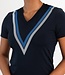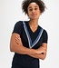 Stijlvol dames t-shirt gemaakt van donkerblauwe single jersey met een vrolijke all-over print en effen inzetten langs de zijnaden. Onderaan in de zoom van dit plus size shirt zit een trekkoord. Met dit getailleerde t-shirt kom je goed voor de dag op de tennisbaan of bij elke andere tak van sport, maar je kunt het ook prima in je vrije tijd dragen.