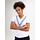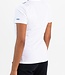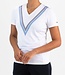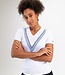 Modieus dames v-hals t-shirt van soepele, witte single jersey. Bovenaan de rug heeft dit mooie getailleerde t-shirt een v-vormige inzet van dichte mesh stof. Bij de hals loopt een print van contrasterende strepen in v-vorm.