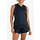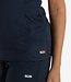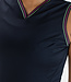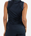 Modieus dames singlet met een luchtige v-hals en aan de achterkant bij de schouders inzetten van powermesh. Deze singlet is gemaakt van donkerblauwe structuur gebreide stof en hij is afgezet met geribde biezen in contrasterende kleuren langs de halsopening en de armopeningen.