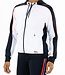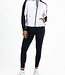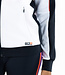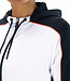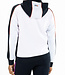 Sportief hooded trainingsjack voor dames. Dit comfortabele loose fit jack is gemaakt van foamy interlock materiaal met als hoofdkleur wit. Het jack heeft langs de schouders, mouwen en in de capuchon inzetten met een all-over print in een contrasterende kleur. De capuchon is van een dubbele laag stof.