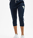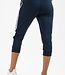 Sportieve dames capri broek, gemaakt van stevige, dubbelgebreide stof. Deze donkerblauwe broek heeft een met een ritssluiting afsluitbare zak aan de achterzijde en twee steekzakken aan de voorkant. Onderaan de pijpen zitten geribde boorden.