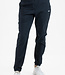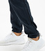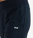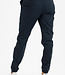 Donkerblauwe dames trainingsbroek, gemaakt van geweven stretch met een tailleboord van zeer elastische multi stretch jersey. Langs de benen zitten inzetten van een dubbele laag stof, waarvan de bovenste laag geperforeerd is. In de zoom onderaan de pijpen zitten ritsen.