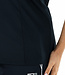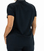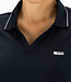 Sportieve tennis polo voor dames. Dit donkerblauwe plus size poloshirt heeft deels perforatie voor extra ventilatie tijdens het sporten. Langs de kraag lopen contrasterende strepen en op de borst is het Sjeng Sports logo gedrukt in dezelfde contrasterende kleuren.
