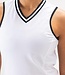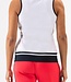 Luchtige, mouwloze dames top van witte single jersey met contrasterende biezen. Deze zomerse singlet is perfect om in te sporten op warme dagen, maar ook heerlijk om zo te dragen.