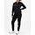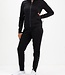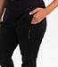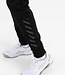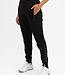 Stijlvolle dames trainingsbroek van zwarte powerstretch met getapete biezen over de benen, in de taille en bij de onderrug. Onderaan de zijkant van de pijpen zit een print met diagonale strepen.